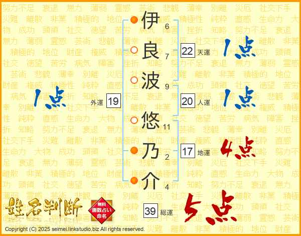 伊(6画)良(7画)波(9画) 悠(11画)乃(2画)介(4画)
