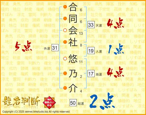 合(6画)同(6画)会(13画)社(8画) 悠(11画)乃(2画)介(4画)