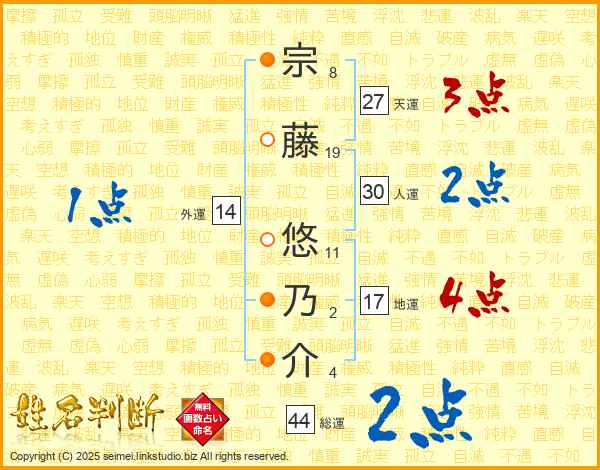 宗(8画)藤(19画) 悠(11画)乃(2画)介(4画)