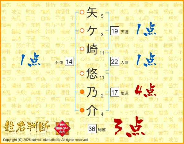 矢ケ崎悠乃介さんの総運は36画の3点!