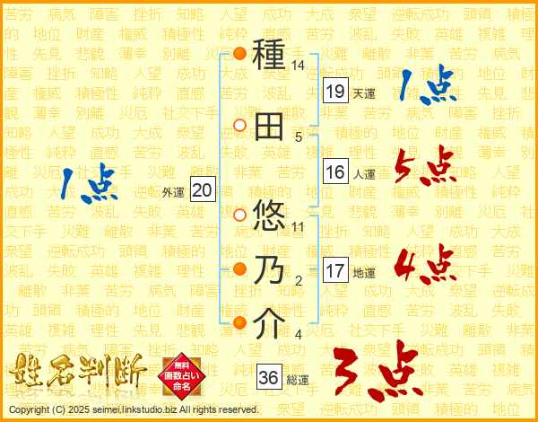 種田悠乃介さんの総運は36画の3点!