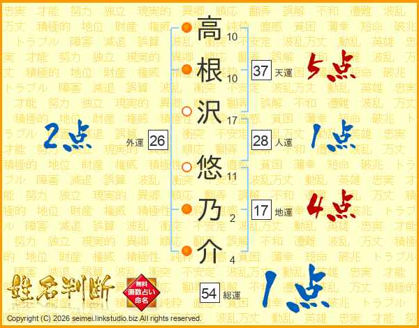 高(10画)根(10画)沢(17画) 悠(11画)乃(2画)介(4画)