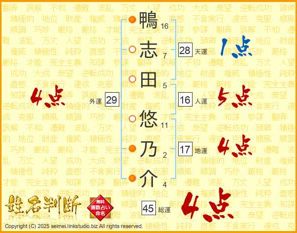 鴨(16画)志(7画)田(5画) 悠(11画)乃(2画)介(4画)