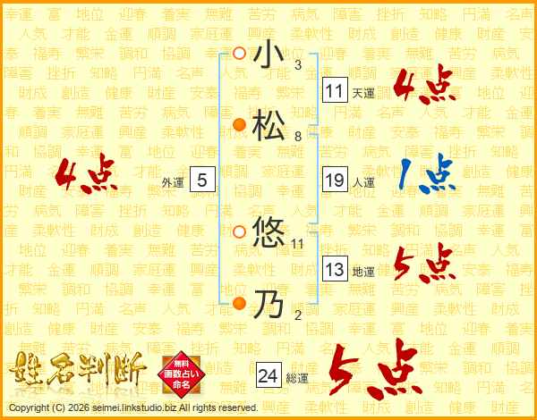 小(3画)松(8画) 悠(11画)乃(2画)