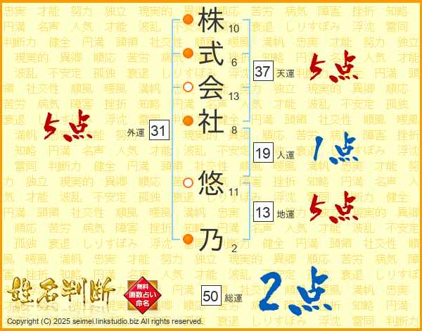 株(10画)式(6画)会(13画)社(8画) 悠(11画)乃(2画)