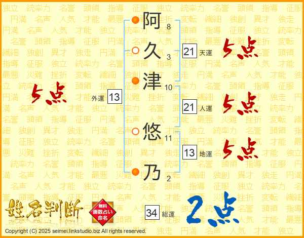 阿(8画)久(3画)津(10画) 悠(11画)乃(2画)