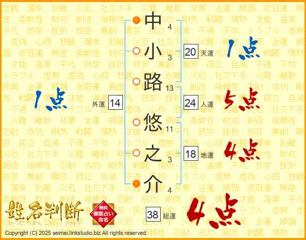 生活面を象徴する運勢です。外部から受ける影響力を表し、結婚運、家庭運や職場、環境への順応性を表します。総運から人運を引いた画数。姓や名が1文字の場合を除く。