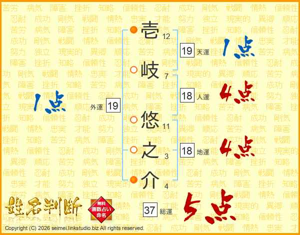 壱(12画)岐(7画) 悠(11画)之(3画)介(4画)