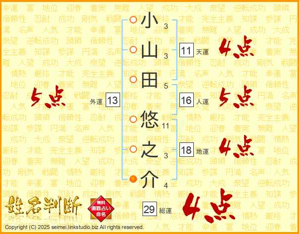 小(3画)山(3画)田(5画) 悠(11画)之(3画)介(4画)