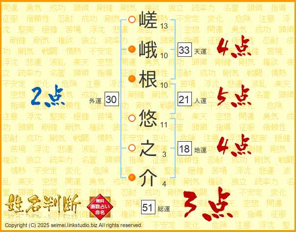 嵯(13画)峨(10画)根(10画) 悠(11画)之(3画)介(4画)