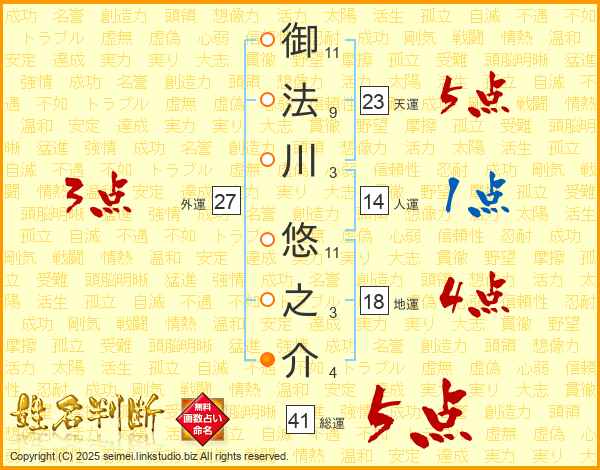 御(11画)法(9画)川(3画) 悠(11画)之(3画)介(4画)