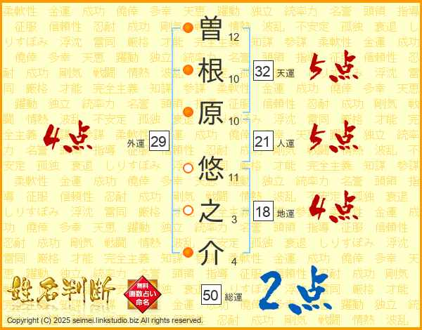 曽(12画)根(10画)原(10画) 悠(11画)之(3画)介(4画)