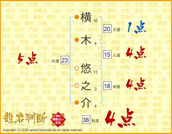 横(16画)木(4画) 悠(11画)之(3画)介(4画)