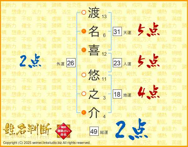 渡(13画)名(6画)喜(12画) 悠(11画)之(3画)介(4画)