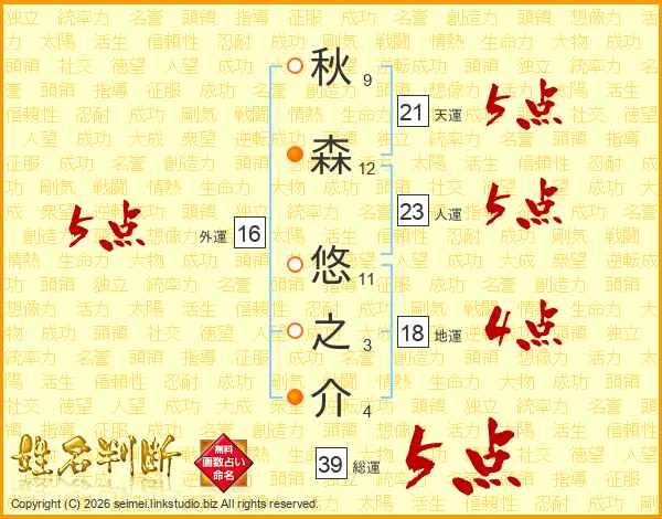 秋森悠之介さんの総運は39画の5点!