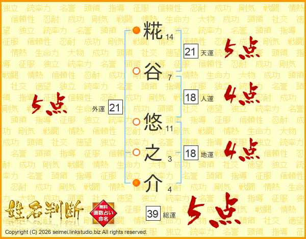 糀(14画)谷(7画) 悠(11画)之(3画)介(4画)