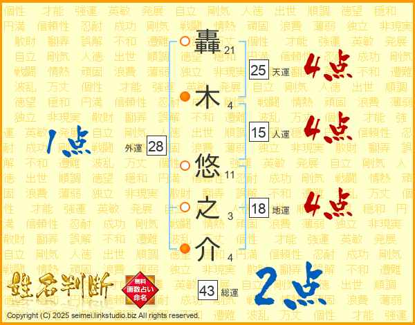 轟(21画)木(4画) 悠(11画)之(3画)介(4画)