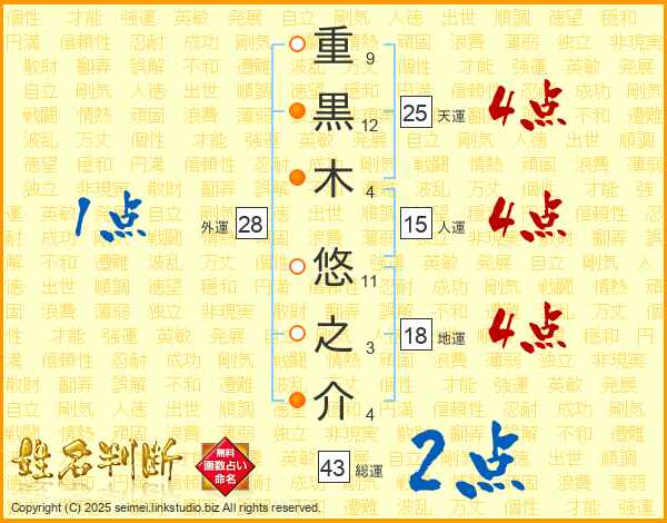 重(9画)黒(12画)木(4画) 悠(11画)之(3画)介(4画)