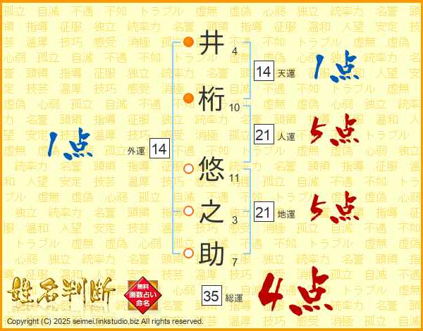 井(4画)桁(10画) 悠(11画)之(3画)助(7画)