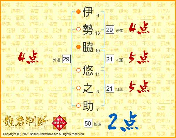 伊(6画)勢(13画)脇(10画) 悠(11画)之(3画)助(7画)