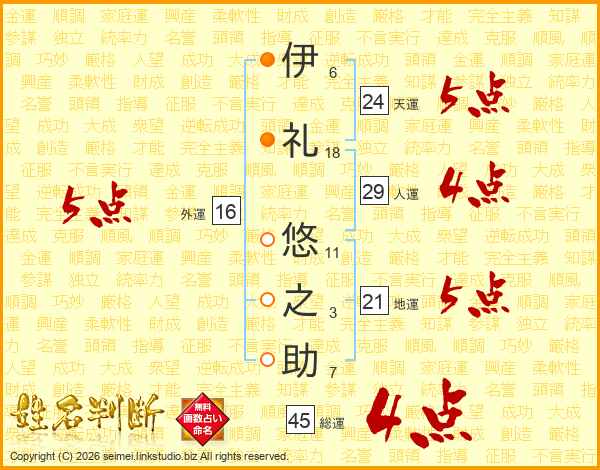伊(6画)礼(18画) 悠(11画)之(3画)助(7画)