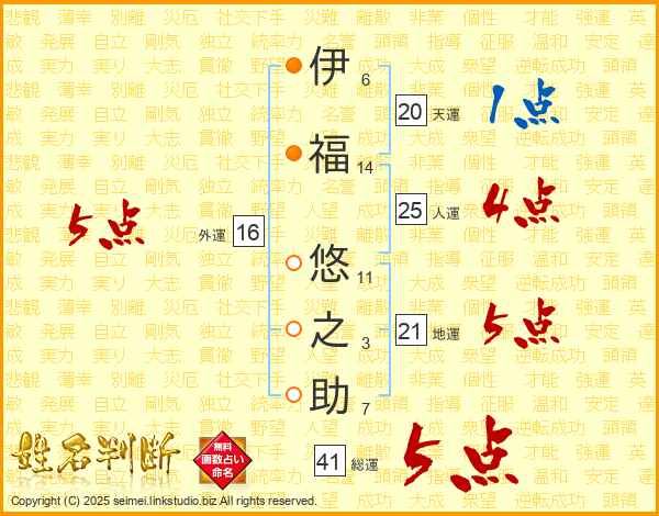 伊(6画)福(14画) 悠(11画)之(3画)助(7画)
