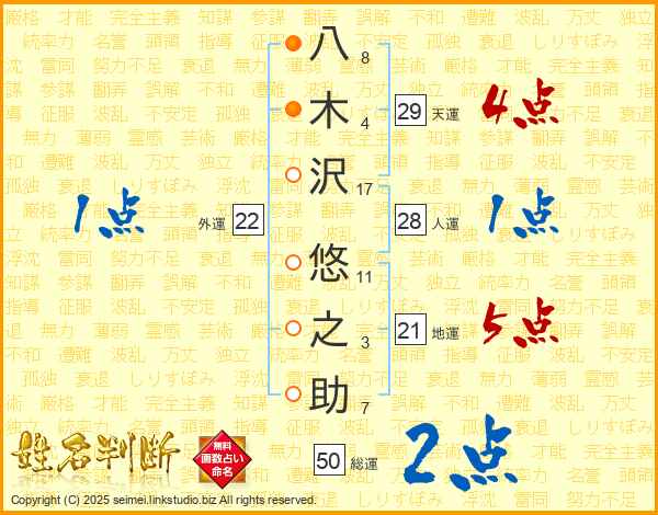 八(8画)木(4画)沢(17画) 悠(11画)之(3画)助(7画)