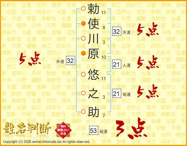勅(11画)使(8画)川(3画)原(10画) 悠(11画)之(3画)助(7画)
