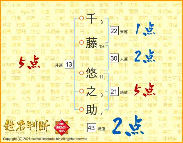千藤悠之助さんの総運は43画の2点!
