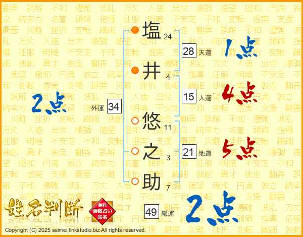 塩(24画)井(4画) 悠(11画)之(3画)助(7画)
