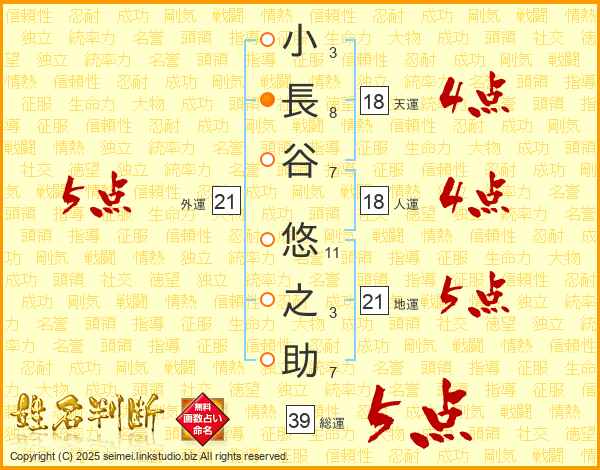 小(3画)長(8画)谷(7画) 悠(11画)之(3画)助(7画)