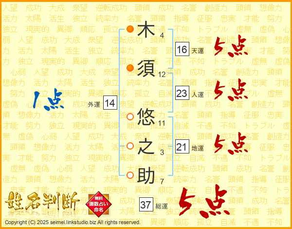 木(4画)須(12画) 悠(11画)之(3画)助(7画)