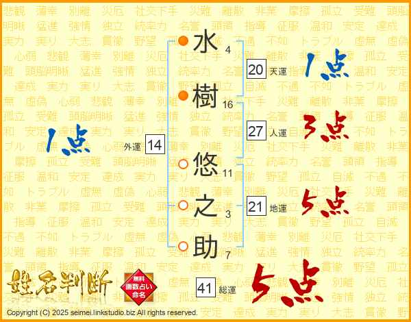 水(4画)樹(16画) 悠(11画)之(3画)助(7画)