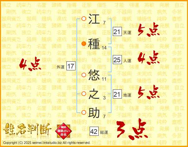 江(7画)種(14画) 悠(11画)之(3画)助(7画)