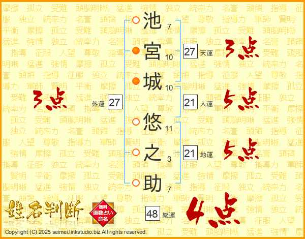 池(7画)宮(10画)城(10画) 悠(11画)之(3画)助(7画)