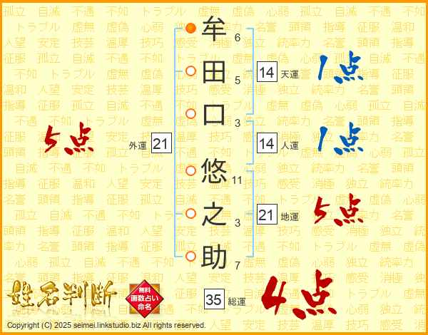 牟(6画)田(5画)口(3画) 悠(11画)之(3画)助(7画)