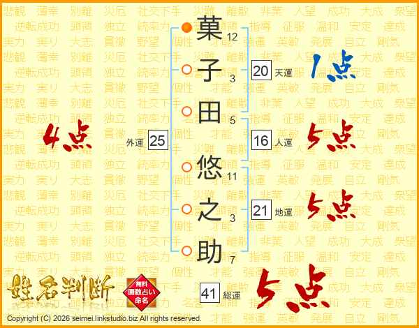 菓子田悠之助さんの総運は41画の5点!