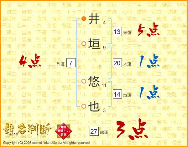 井(4画)垣(9画) 悠(11画)也(3画)