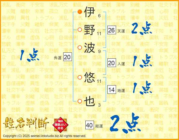 伊(6画)野(11画)波(9画) 悠(11画)也(3画)