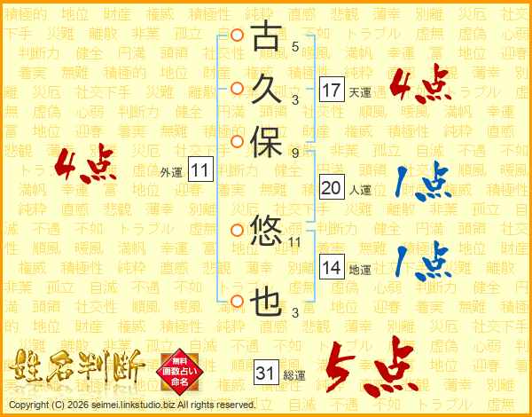 古久保悠也さんの総運は31画の5点!