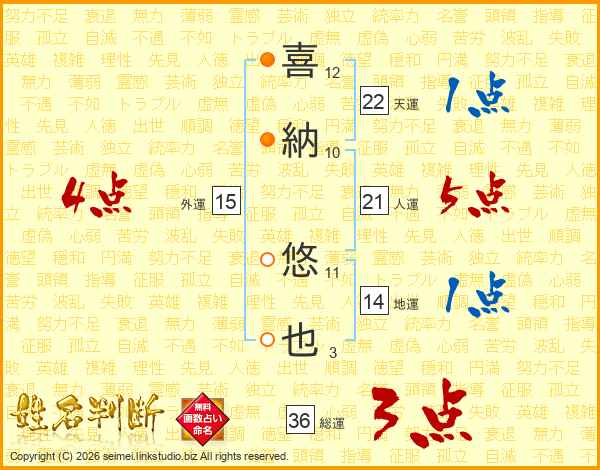 喜(12画)納(10画) 悠(11画)也(3画)