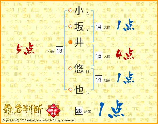 小(3画)坂(7画)井(4画) 悠(11画)也(3画)