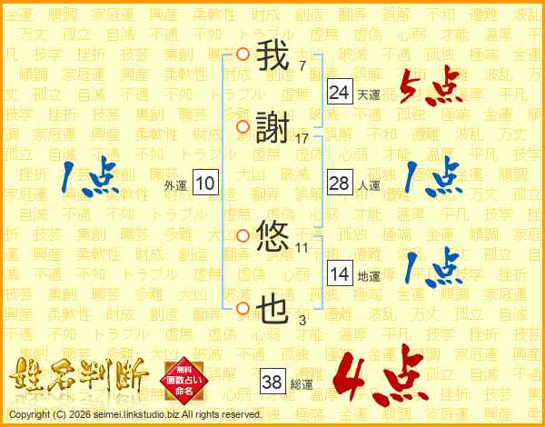 我謝悠也さんの総運は38画の4点!