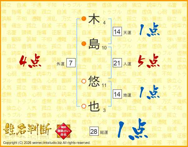 生活面を象徴する運勢です。外部から受ける影響力を表し、結婚運、家庭運や職場、環境への順応性を表します。総運から人運を引いた画数。姓や名が1文字の場合を除く。