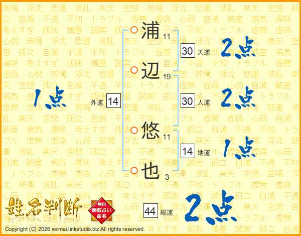 浦(11画)辺(19画) 悠(11画)也(3画)