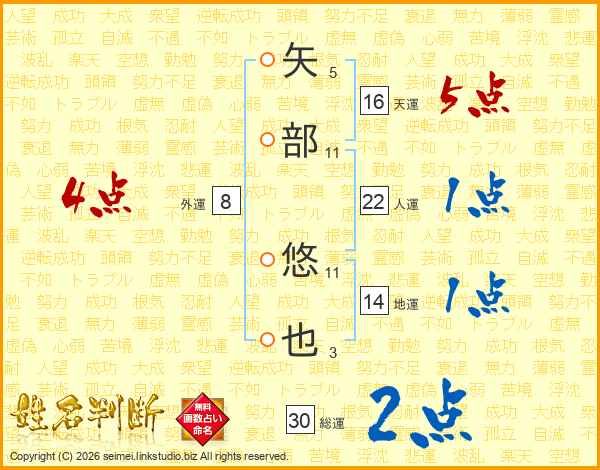 生活面を象徴する運勢です。外部から受ける影響力を表し、結婚運、家庭運や職場、環境への順応性を表します。総運から人運を引いた画数。姓や名が1文字の場合を除く。