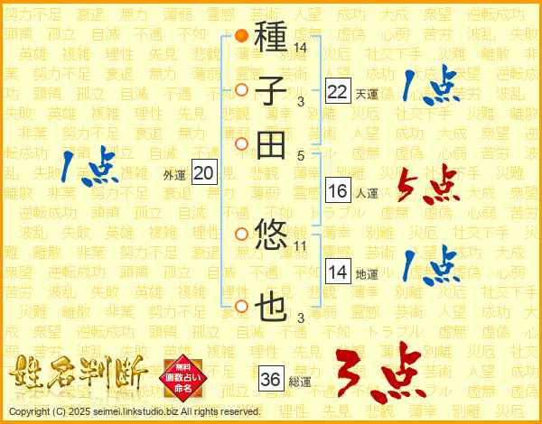 種(14画)子(3画)田(5画) 悠(11画)也(3画)