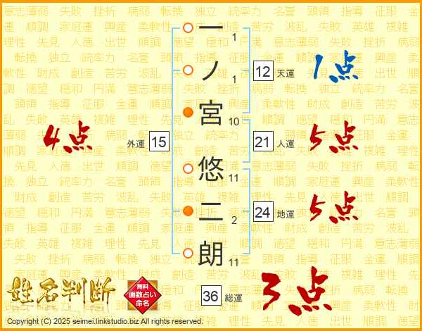 一(1画)ノ(1画)宮(10画) 悠(11画)二(2画)朗(11画)