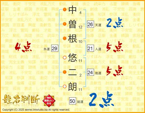 中(4画)曽(12画)根(10画) 悠(11画)二(2画)朗(11画)