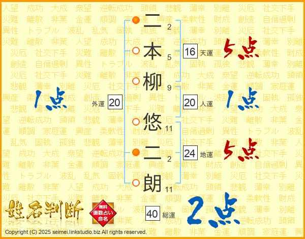 二(2画)本(5画)柳(9画) 悠(11画)二(2画)朗(11画)